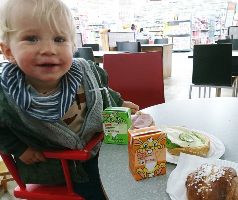 Vi åkte till Citymarket, och började med att fika på deras butikscafé. Han är i en så underbar ålder nu, trots att det är mycket ”Nej nej” och ”Jag vill int!”. Han pratar massor, och jag som inte har något att jämföra med är ändå så ofattbart stolt över hans tydliga språk och talförmåga. Det är så roligt då man verkligen kan föra diskussioner med honom redan.